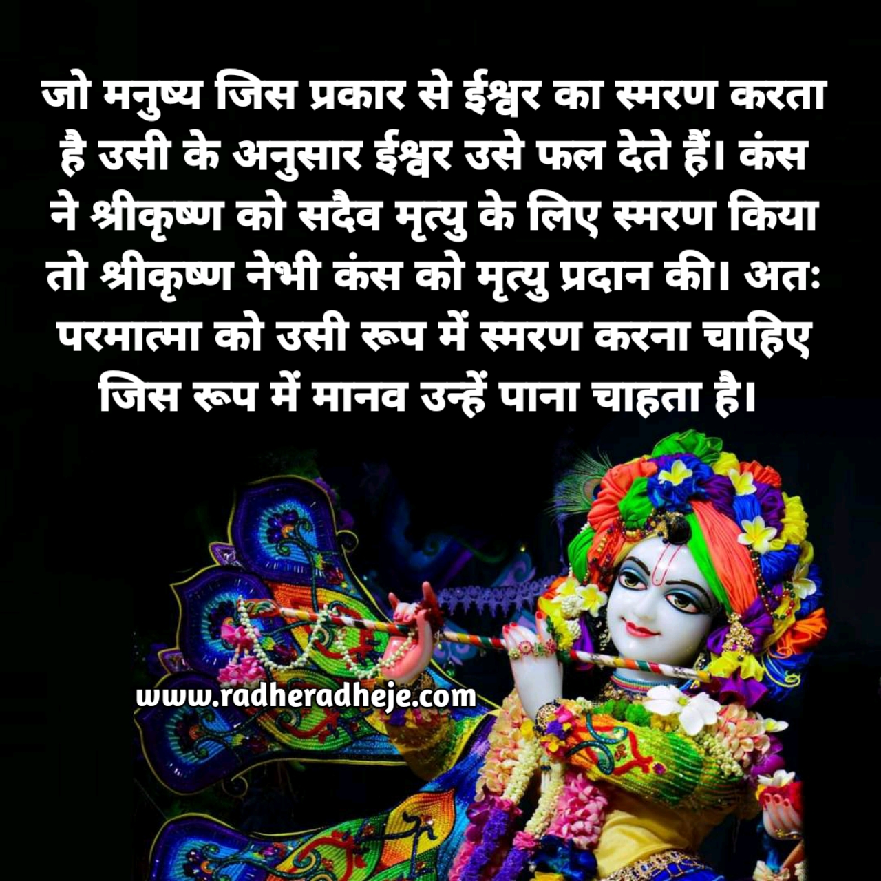 जो मनुष्य जिस प्रकार से ईश्वर का स्मरण करता है उसी के अनुसार ईश्वर उसे फल देते हैं। कंस ने श्रीकृष्ण को सदैव मृत्यु के लिए स्मरण किया तो श्रीकृष्ण ने भी कंस को मृत्यु प्रदान की। अतः परमात्मा को उसी रूप में स्मरण करना चाहिए जिस रूप में मानव उन्हें पाना चाहता है। According to the way a person remembers God, God gives him fruit. Kamsa always remembered Shri Krishna for death, while Krishna also gave death to Kansa. Therefore, God should remember the form in which human wants to attain them.