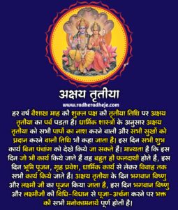 धार्मिक शास्त्रों के अनुसार अक्षय तृतीया को बेहद ही शुभ माना गया है, अक्षय तृतीया के शुभ दिन भगवान विष्णु और माता लक्ष्मी की पूजा का विधान है। मान्यता है कि इस दिन जो भी शुभ कार्य किए जाते हैं, उनका शुभ फल कभी समाप्त नहीं होता है, इस दिन को आखा तीज के नाम से भी जाना जाता है। इस तिथि को सूर्य और बुध का मेल होता है, इसी दिन वृंदावन के बांके बिहारी चरण दर्शन एवं प्रमुख तीर्थ स्थल बद्रीनारायण के पट भी खुलते हैं। इसी दिन मां गंगा स्वर्ग से धरती पर अवतरित हुईं हैं और मां अन्नपूर्णा का जन्मदिवस भी इसी तिथि का माना गया है। अक्षय तृतीया के दिन ही युधिष्ठर जी को अक्षय पात्र की प्राप्ति हुई थी जिसमें कभी भी भोजन समाप्त नहीं होता था।