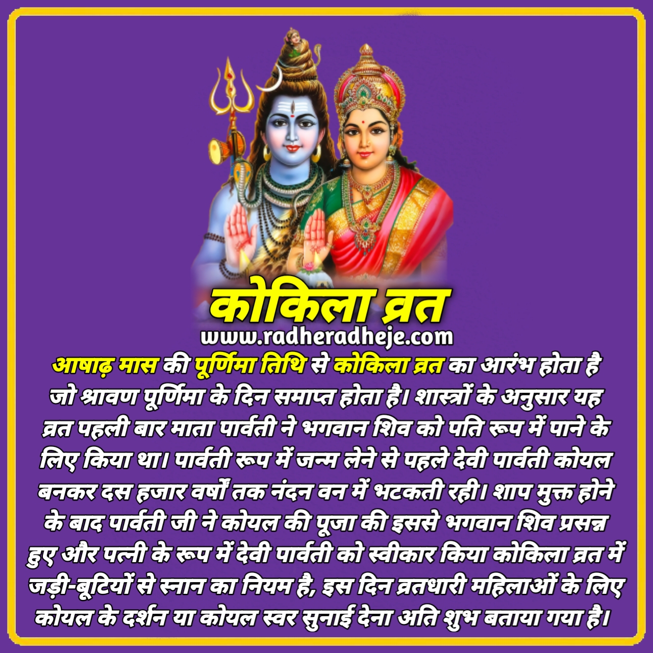 कोकिला व्रत (Kokila Vrat ) आषाढ़ मास की पूर्णिमा तिथि से कोकिला व्रत का आरंभ होता है जो श्रावण पूर्णिमा के दिन समाप्त होता है। कोकिला व्रत सभी प्रकार की मनोकामनाओं को पूर्ण करने वाला व्रत माना गया है. शास्त्रों के अनुसार यह व्रत पहली बार माता पार्वती ने भगवान शिव को पति रूप में पाने के लिए किया था। पार्वती रूप में जन्म लेने से पहले देवी पार्वती कोयल बनकर दस हजार वर्षों तक नंदन वन में भटकती रही। शाप मुक्त होने के बाद पार्वती जी ने कोयल की पूजा की इससे भगवान शिव प्रसन्न हुए और पत्नी के रूप में देवी पार्वती को स्वीकार किया कोकिला व्रत में जड़ी-बूटियों से स्नान का नियम है, इस दिन व्रतधारी महिलाओं के लिए कोयल के दर्शन या कोयल स्वर सुनाई देना अति शुभ बताया गया है।