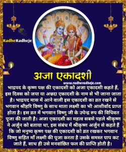 भाद्रपद के कृष्ण पक्ष की एकादशी को अजा एकादशी कहते हैं, इस दिवस को जया या अन्नदा एकादशी के नाम से भी जाना जाता है। भाद्रपद मास में आने वाली इस एकादशी का व्रत रखने से भगवान श्रीहरि विष्णु के साथ माता लक्ष्मी का भी आशीर्वाद प्राप्त होता है। इस व्रत में भगवान विष्णु जी के उपेन्द्र रुप की विधिवत पूजा की जाती है। अजा एकादशी का महत्व सबसे पहले श्रीकृष्ण ने अर्जुन को बताया था, इस संबंध में श्रीकृष्ण अर्जुन से कहते हैं कि जो मनुष्य कृष्ण पक्ष की एकादशी को व्रत रखकर भगवान विष्णु सहित माँ लक्ष्मी की पूजा करता है उसके समस्त पाप कट जाते हैं, साथ ही उसे मनवांछित फल की प्राप्ति होती है।