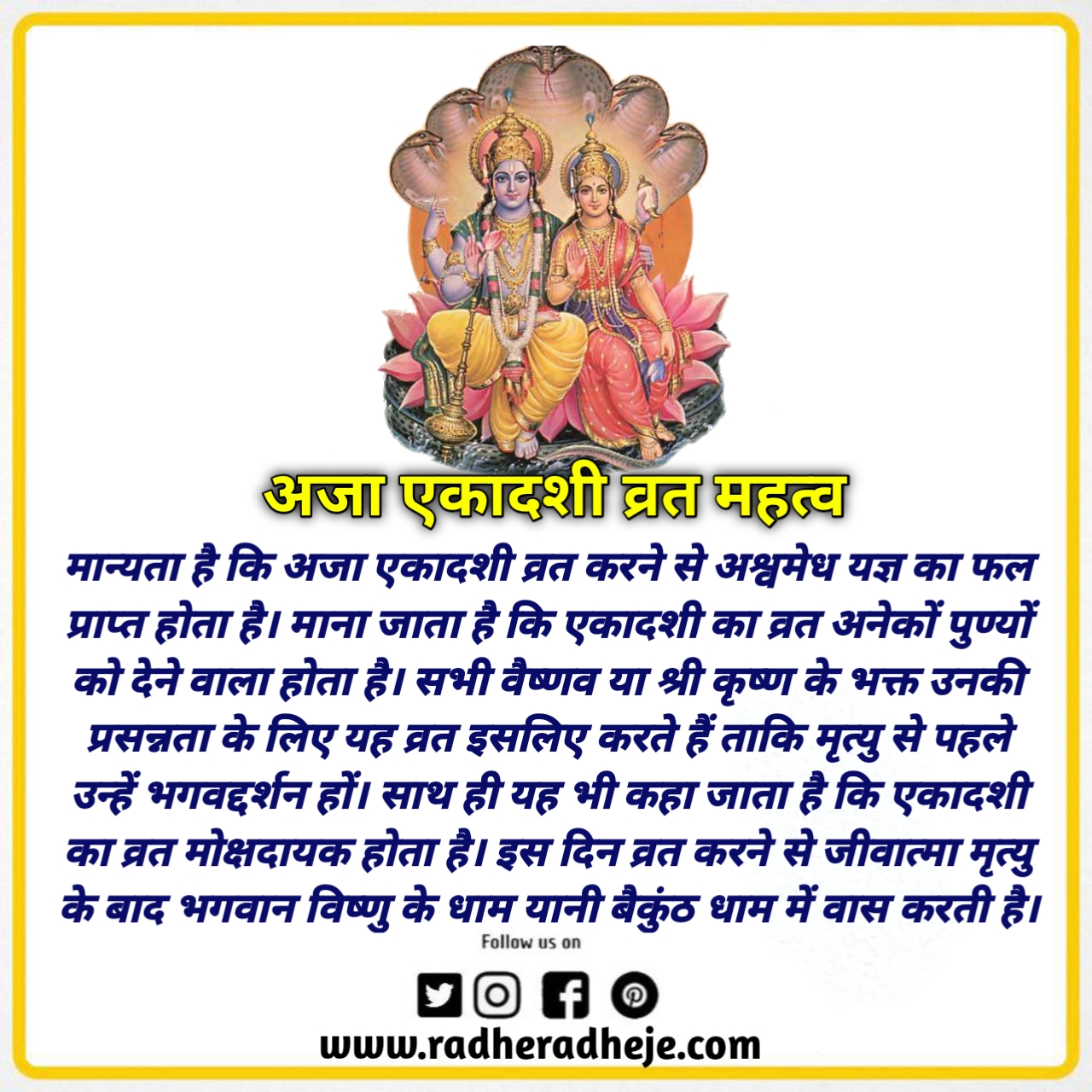 अजा एकादशी का महत्व मान्यता है कि अजा एकादशी व्रत करने से अश्वमेध यज्ञ का फल प्राप्त होता है। माना जाता है कि एकादशी का व्रत अनेकों पुण्यों को देने वाला होता है। सभी वैष्णव या श्री कृष्ण के भक्त उनकी प्रसन्नता के लिए यह व्रत इसलिए करते हैं ताकि मृत्यु से पहले उन्हें भगवद्दर्शन हों। साथ ही यह भी कहा जाता है कि एकादशी का व्रत मोक्षदायक होता है। इस दिन व्रत करने से जीवात्मा मृत्यु के बाद भगवान विष्णु के धाम यानी बैकुंठ धाम में वास करती है।