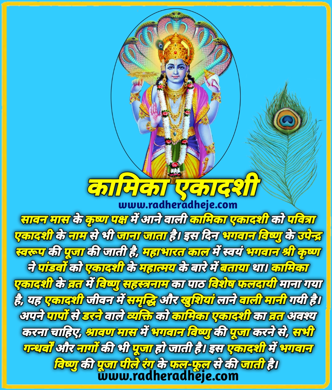 सावन मास के कृष्ण पक्ष में आने वाली कामिका एकादशी को पवित्रा एकादशी के नाम से भी जाना जाता है। इस दिन भगवान विष्णु के उपेन्द्र स्वरूप की पूजा की जाती है, महाभारत काल में स्वयं भगवान श्री कृष्ण ने पांडवों को एकादशी के महात्मय के बारे में बताया थ। कामिका एकादशी के व्रत में विष्णु सहस्त्रनाम का पाठ विशेष फलदायी माना गया है, यह एकादशी जीवन में समृद्धि और खुशियां लाने वाली मानी गयी है। अपने पापों से डरने वाले व्यक्ति को कामिका एकादशी का व्रत अवश्य करना चाहिए, श्रावण मास में भगवान विष्णु की पूजा करने से, सभी गन्धर्वों और नागों की भी पूजा हो जाती है। इस एकादशी में भगवान विष्णु की पूजा पीले रंग के फल-फूल से की जाती है।