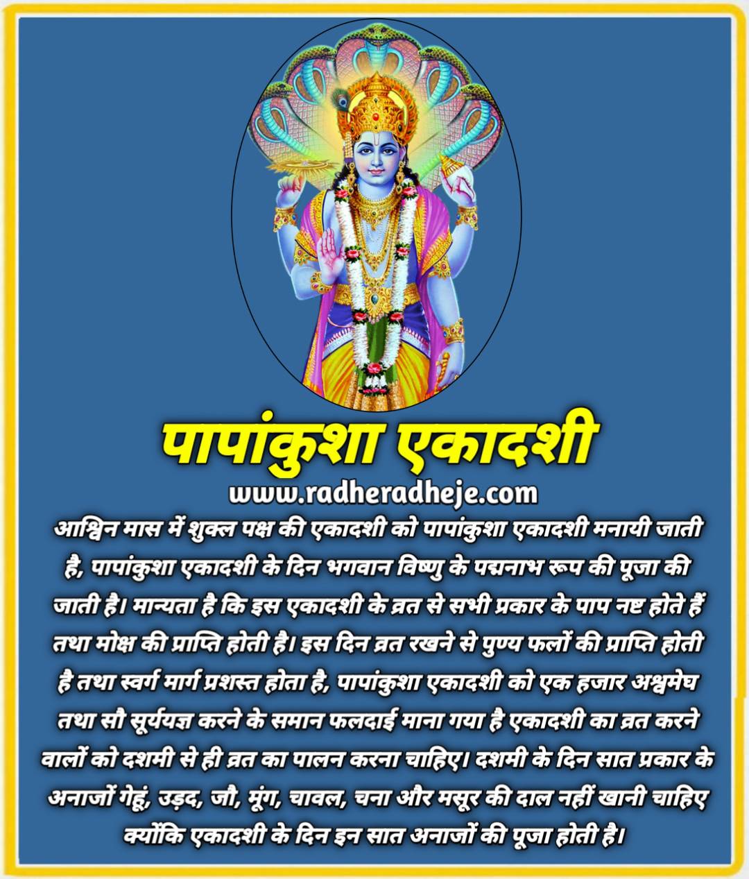 आश्विन मास के शुक्ल पक्ष की एकादशी को पापांकुशा एकादशी कहते हैं। इस एकादशी पर मनोवांछित फल की प्राप्ति के लिए भगवान विष्णु की पूजा की जाती है। धर्म ग्रंथों के अनुसार, जो मनुष्य कठिन तपस्याओं के द्वारा फल प्राप्त करते हैं, वही फल इस एकादशी पर शेषनाग पर शयन करने वाले श्रीविष्णु को नमस्कार करने से ही मिल जाते हैं और मनुष्य को यमलोक के दु:ख नहीं भोगने पड़ते हैं। यह एकादशी उपवासक (व्रत करने वाले) के मातृपक्ष के दस और पितृपक्ष के दस पितरों को विष्णु लोक लेकर जाती है।
