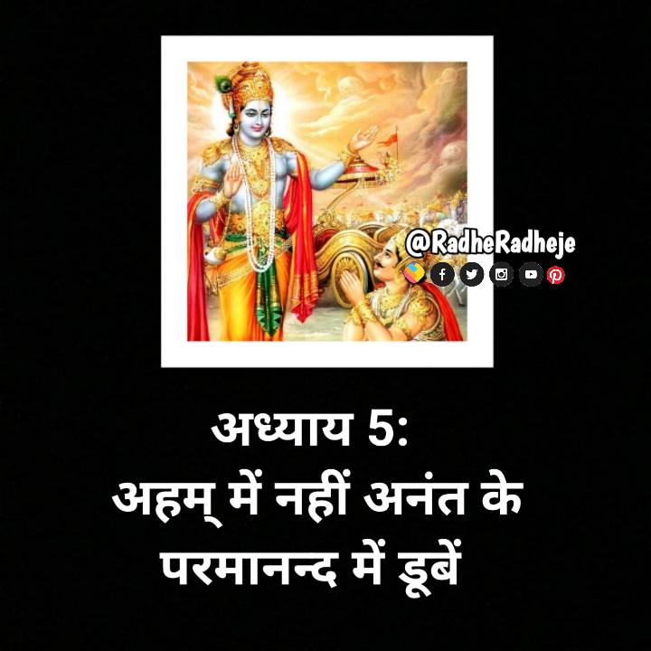 पाँचवे अध्याय में भगवान श्री कृष्ण ने कहा कि कर्म के साथ जो मन का संबंध है, उसके संस्कार पर या उसे विशुद्ध करने पर विशेष ध्यान दिलाया गया है। किसी एक मार्ग पर ठीक प्रकार से चले तो समान फल प्राप्त होता है। जीवन के जितने कर्म हैं, सबको समर्पण कर देने से व्यक्ति एकदम शांति के ध्रुव बिंदु पर पहुँच जाता है। किसी एक मार्ग पर ठीक प्रकार से चले तो समान फल प्राप्त होता है। जीवन के जितने कर्म हैं, सबको समर्पण कर देने से व्यक्ति एकदम शांति के ध्रुव बिंदु पर पहुँच जाता है और जल में खिले कमल के समान कर्म रूपी जल से लिप्त नहीं होता।