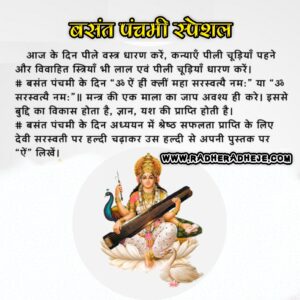 1. बसंत पंचमी के दिन प्रातः उठकर, बच्चों को अपनी- अपनी हथेलियां देखनी चाहिए। क्योंकि कहते हैं- “कराग्रे लक्ष्मी बसते, कर मध्ये सरस्वती, कर मूले तू गोविदः प्रभाते कर दर्शनम्।” यानी हथेली में माँ सरस्वती का वास होती है, जिनकों देखना माँ सरस्वती के दर्शन करने के बराबर होती है।