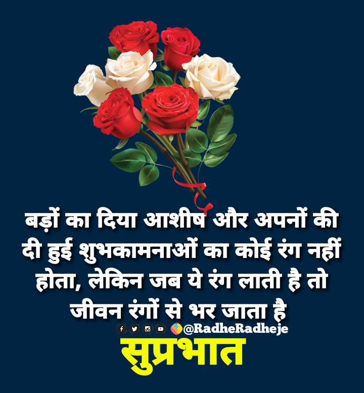Good Morning सुप्रभात RadheRadheje 5 years ago बड़ों का दिया आशीष और अपनों की दी हुई शुभकामनाओं का कोई रंग नहीं होता, लेकिन जब ये रंग लाती है तो जीवन रंगों से भर जाता है