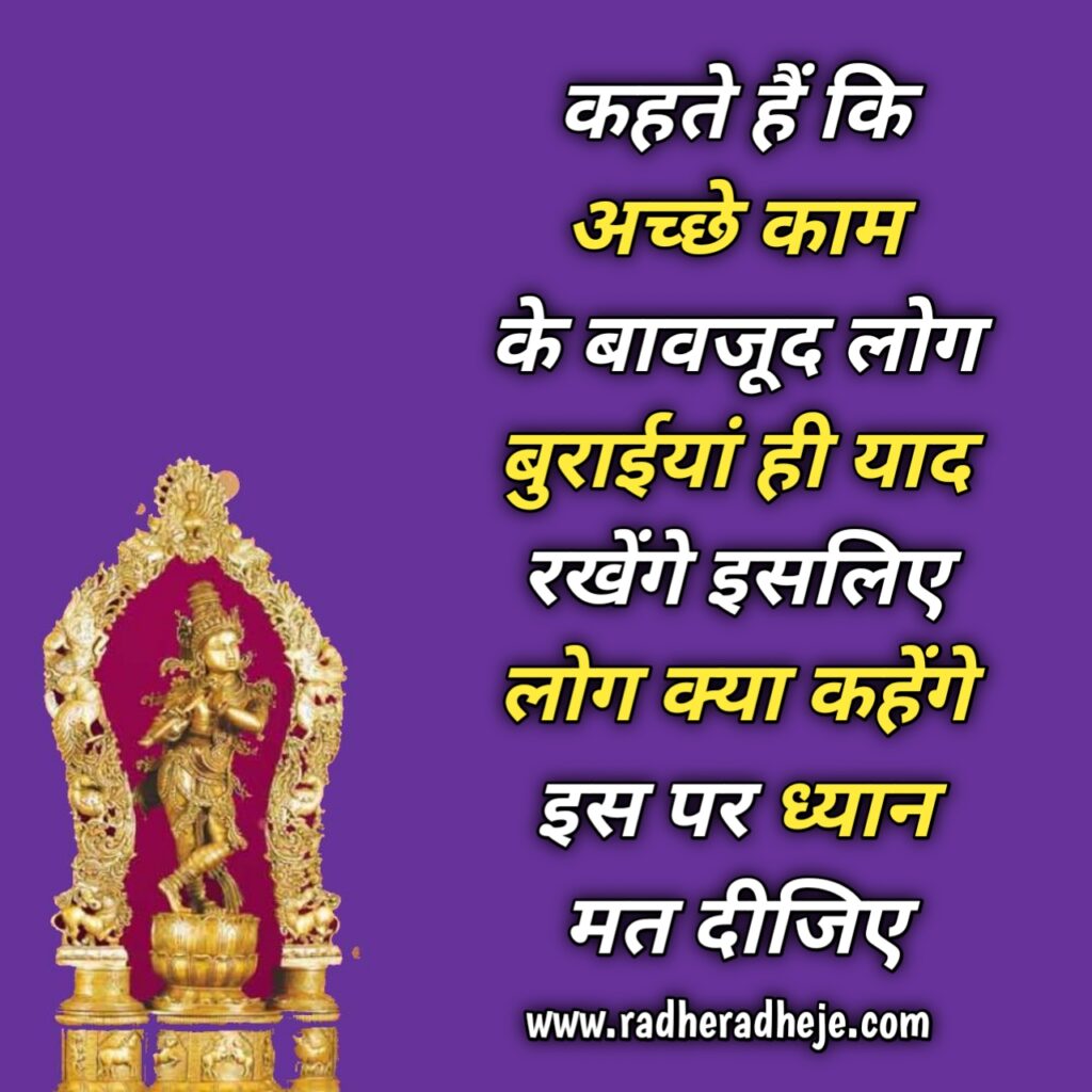 Hare Krishna Quotes RadheRadheje 5 years ago कहते हैं अच्छे काम के बावजूद लोग बुराइयां ही याद रखेंगे इसलिए लोग क्या कहेंगे इस पर ध्यान मत दीजिए जय श्री राधे कृष्णा