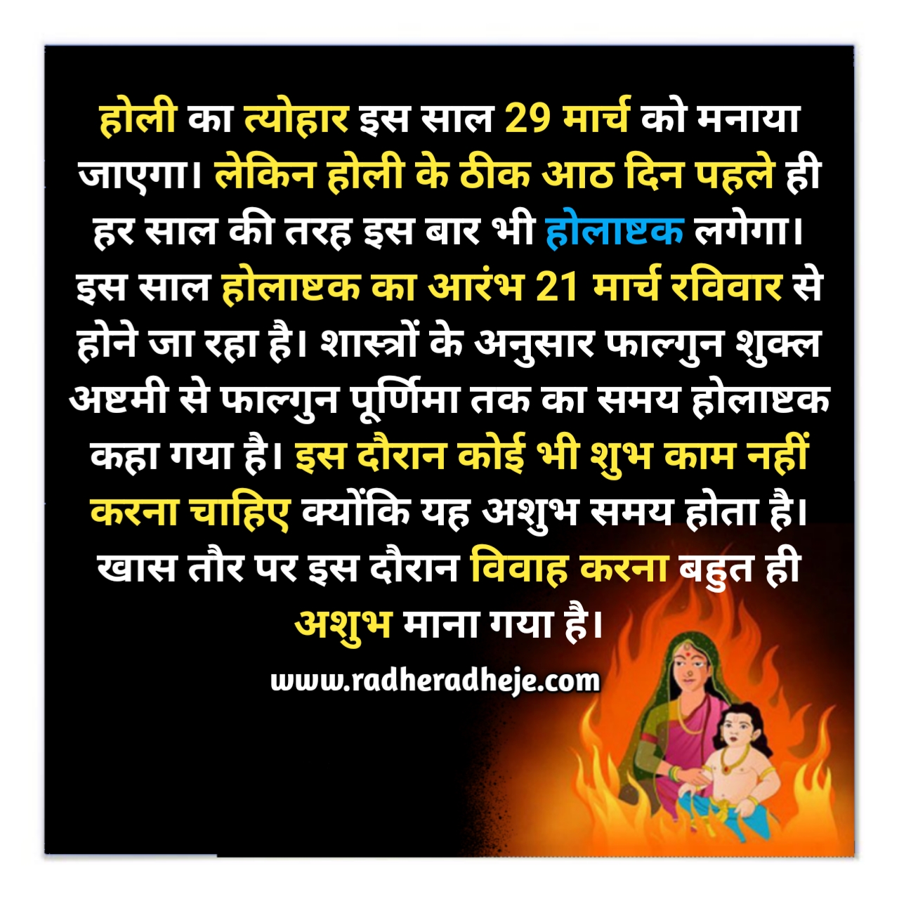 इस वर्ष होलाष्टक 21 मार्च, रविवार से प्रारम्भ हो रहा है, जो 28 मार्च होलिका दहन के साथ ही समाप्त हो जाएगा, अर्थात् आठ दिनों का यह होलाष्टक दोष रहेगा। जिसमें सभी शुभ कार्य वर्जित है।
