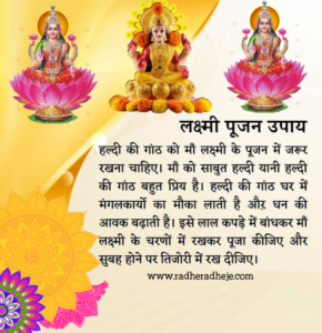 हल्दी की गांठ को मां लक्ष्मी के पूजन में जरूर रखना चाहिए मां को साबुत हल्दी यानि हल्दी की गांठ बहुत प्रिय है हल्दी की गांठ घर में मंगल कार्यों का मौका लाती है और धन की आवक पढ़ाती है इसे लाल कपड़े में बांधकर मां लक्ष्मी के चरणों में रखकर पूजा कीजिए और सुबह होने पर तिजोरी में रख दीजिए
