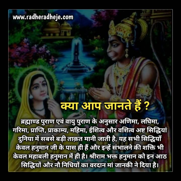 पुराण एवं वायु पुराण के अनुसार अणिमा, लघिमा, गरिमा, प्राप्ति, प्राकाम्य, महिमा, ईशित्व और वशित्व अष्ट सिद्धियां दुनिया में सबसे बड़ी ताक़त मानी जाती है, यह सभी सिद्धियाँ केवल हनुमान जी के पास ही हैं और इन्हें संभालने की शक्ति भी केवल महाबली हनुमान में ही है। श्रीराम भक्त हनुमान को इन आठ सिद्धियों और नौ निधियों का वरदान मां जानकी ने दिया है।