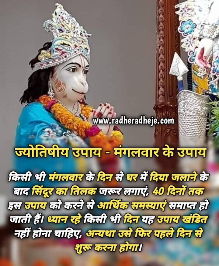 किसी भी मंगलवार के दिन से घर में दिया जलाने के बाद सिंदूर का तिलक जरूर लगाएं, 40 दिनों तक इस उपाय को करने से आर्थिक समस्याएं समाप्त हो जाती हैं। ध्यान रहे किसी भी दिन यह उपाय खंडित नहीं होना चाहिए, अन्यथा उसे फिर पहले दिन से शुरू करना होगा।