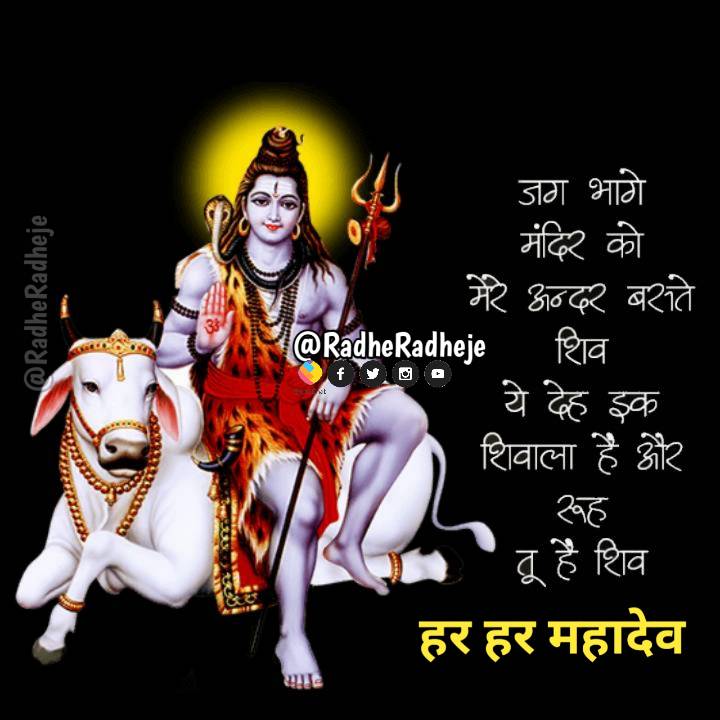 सुप्रभात हर हर महादेव RadheRadheje 5 years ago जग भागे मंदिर को मेरे अन्दर बसते शिव ये देह इक शिवाला है और रुह तू है शिव हर हर महादेव