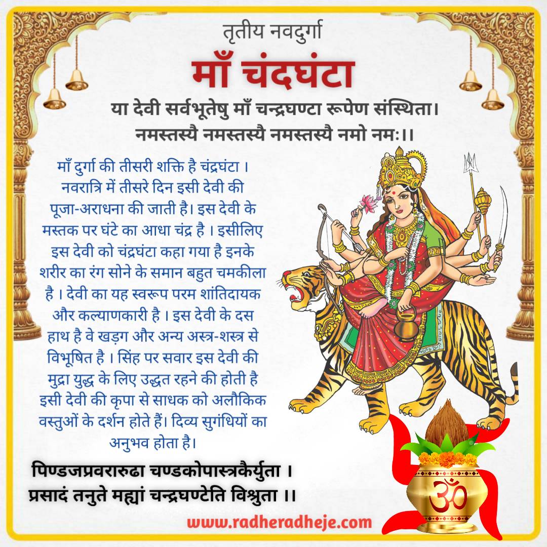 अर्थात- मां दुर्गा की तीसरी शक्ति का नाम चंद्रघंटा है। इनके मस्तक में घंटे के आकार का अर्धचंद्र है। इनके शरीर का रंग स्वर्ण के समान चमकीला है। इनके दस हाथ हैं। इनके दस हाथों में शस्त्र आदि हैं। इनका वाहन सिंह है। इनकी मुद्रा युद्ध के लिए तैयार रहने जैसी है। इनके घंटे की भयानक ध्वनि से अत्याचारी दानव, दैत्य आदि सभी डरते हैं। महत्व असुरों के साथ युद्ध में देवी चंद्रघंटा ने घंटे की टंकार से असुरों का नाश कर दिया था। नवरात्रि के तृतीय दिन इनका पूजन किया जाता है। इनके पूजन से साधक को मणिपुर चक्र के जाग्रत होने वाली सिद्धियां स्वत: प्राप्त हो जाती हैं तथा सांसारिक कष्टों से मुक्ति मिलती है।