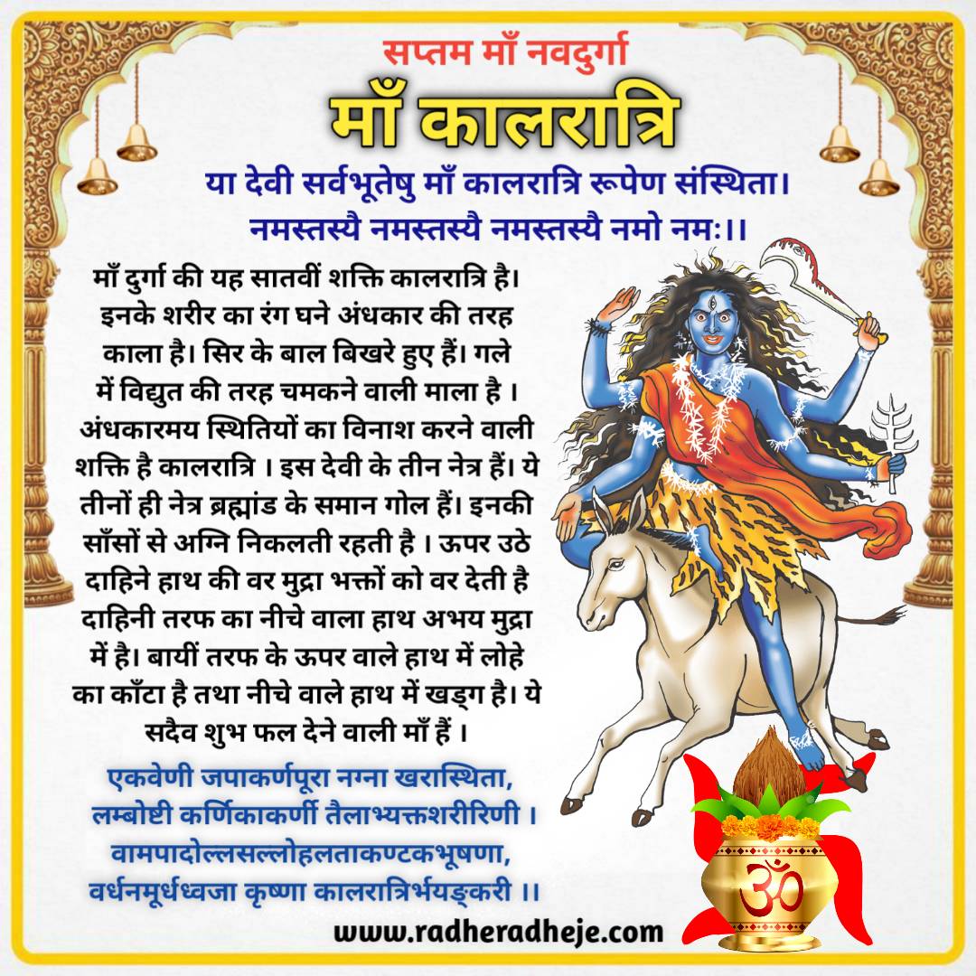 मां दुर्गा जी की सातवीं शक्ति कालरात्रि के नाम से जानी जाती हैं। इनके शरीर का रंग घने अंधकार की तरह एकदम काला है। सिर के बाल बिखरे हुए हैं। गले में विद्युत की तरह चमकने वाली माला है। इनके तीन नेत्र हैं। ये तीनों नेत्र ब्रह्माण्ड के सदृश्य गोल हैं। इनसे विद्युत के समान चमकीली किरणें निरूसृत होती रहती हैं। इनकी नासिका के श्वांस प्रश्वांस से अग्नि की भंयकर ज्वालाएं निकलती रहती हैं। इनका वाहन गर्दभ है। ऊपर उठे हुए दाहिने हाथ की वरमुद्रा से सभी को वर प्रदान करती हैं।