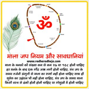 माला के मनकों की संख्या कम से कम २७ या १०८ होनी चाहिए हर मनके के बाद एक गाँठ जरूर लगी होनी चाहिए. मंत्र जप के समय तर्जनी अंगुली से माला का स्पर्श नहीं होना चाहिए साथ ही सुमेरु का उल्लंघन भी नहीं होना चाहिए. मंत्र जप के समय माला किसी वस्त्र से ढंकी होनी होनी चाहिए या गोमुखी में होनी चाहिए