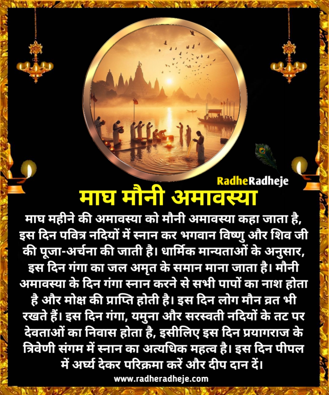माघ महीने की अमावस्या को मौनी अमावस्या कहा जाता है। यह दिन स्नान, दान, मौन व्रत और आत्मशुद्धि के लिए अत्यंत पुण्यदायी माना गया है। इस दिन भगवान विष्णु और महादेव की पूजा का विशेष विधान है।