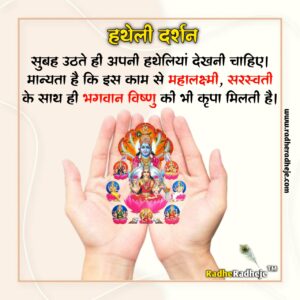 अर्थात (मेरे) हाथ के अग्रभाग में लक्ष्मी का, मध्य में सरस्वती का और मूल भाग में भगवान विष्णु का निवास है।