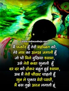 मै फकीर हुँ तेरी महोब्बत की, तेरे नाम का अलख जगाती हुँ जो भी मिले दुखिया श्यामा, उसे तेरी कथा सुनाती हुँ दर दर की ठोंकर बहुत हुई श्यामा, अब मैं तेरी चौखट चाहती हुँ सुन ले पुकार मेरी प्यारी,मै बस तुझे अरज लगती हूं