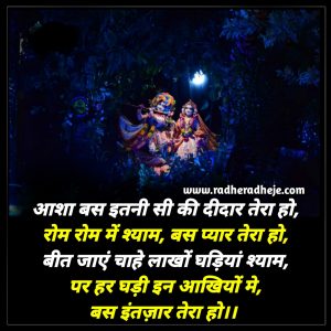 आशा बस इतनी सी की दीदार तेरा हो, रोम रोम में श्याम, बस प्यार तेरा हो, बीत जाएं चाहे लाखों घड़ियां श्याम, पर हर घड़ी इन आखियों मे, बस इंतज़ार तेरा हो हरे कृष्ण