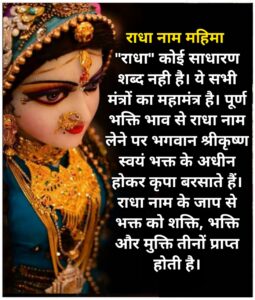“राधा” कोई साधारण शब्द नही है। ये सभी मंत्रों का महामंत्र है। पूर्ण भक्ति भाव से राधा नाम लेने पर भगवान श्रीकृष्ण स्वयं भक्त के अधीन होकर कृपा बरसाते हैं। राधा नाम के जाप से भक्त को शक्ति, भक्ति और मुक्ति तीनों प्राप्त होती है।