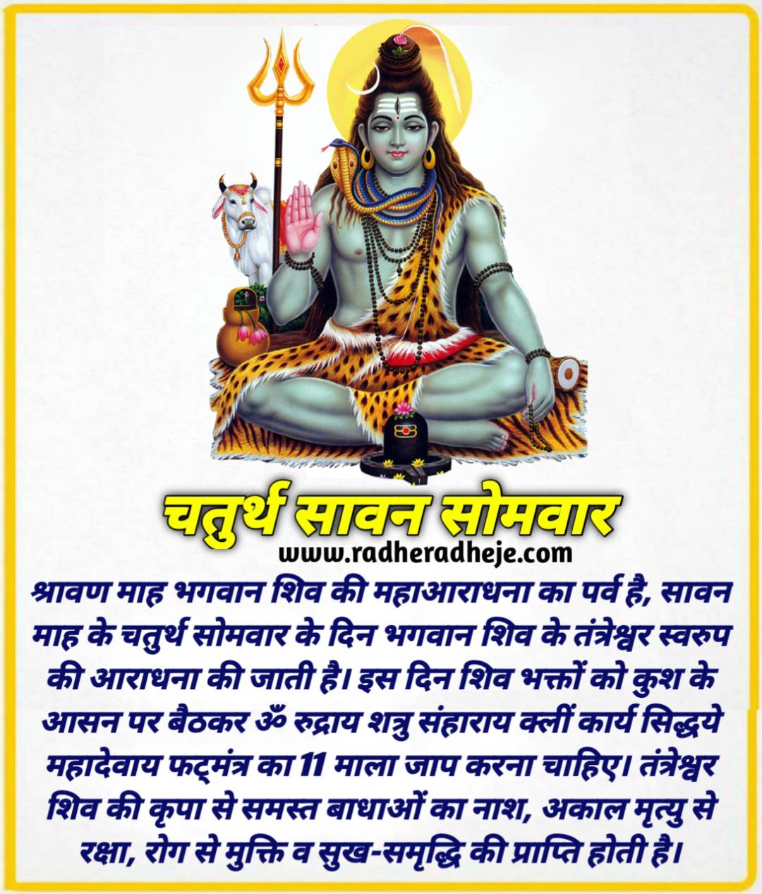 श्रावण माह भगवान शिव की महाआराधना का पर्व है, सावन माह के चतुर्थ सोमवार के दिन भगवान शिव के तंत्रेश्वर स्वरुप की आराधना की जाती है। इस दिन शिव भक्तों को कुश के आसन पर बैठकर ॐ रुद्राय शत्रु संहाराय क्लीं कार्य सिद्धये महादेवाय फट्मंत्र का 11 माला जाप करना चाहिए। तंत्रेश्वर शिव की कृपा से समस्त बाधाओं का नाश, अकाल मृत्यु से रक्षा, रोग से मुक्ति व सुख-समृद्धि की प्राप्ति होती है।