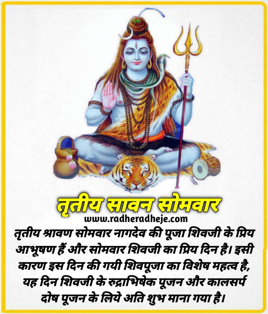 तृतीय श्रावण सोमवार नागदेव की पूजा शिवजी के प्रिय आभूषण हैं और सोमवार शिवजी का प्रिय दिन है। इसी कारण इस दिन की गयी शिवपूजा का विशेष महत्व है, यह दिन शिवजी के रुद्राभिषेक पूजन और कालसर्प दोष पूजन के लिये अति शुभ माना गया है।
