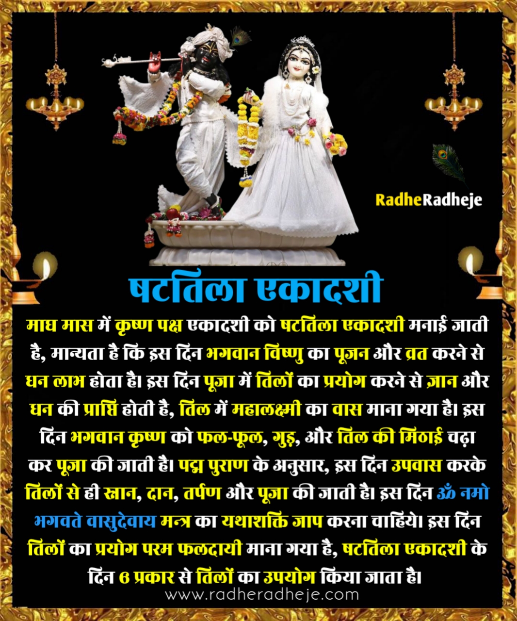 इस दिन तिल से स्नान, दान, हवन, भोजन और तर्पण करने का विधान है। इसलिए इसे षट + तिल = षटतिला कहा जाता है।