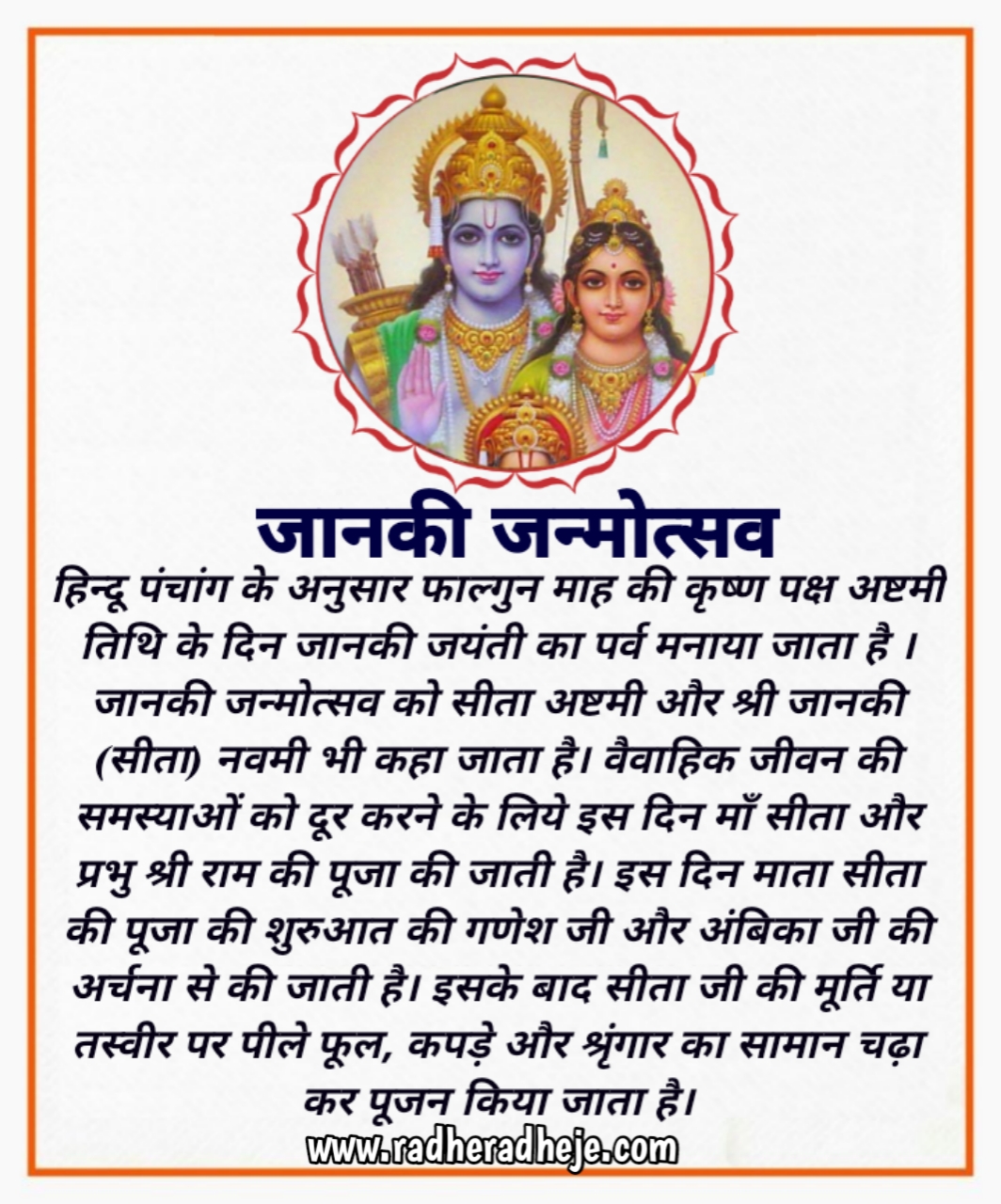 हिन्दू पंचांग के अनुसार फाल्गुन माह की कृष्ण पक्ष अष्टमी तिथि के दिन जानकी जयंती का पर्व मनाया जाता है। जानकी जन्मोत्सव को सीता अष्टमी और श्री जानकी (सीता) नवमी भी कहा जाता है। वैवाहिक जीवन की समस्याओं को दूर करने के लिये इस दिन माँ सीता और प्रभु श्री राम की पूजा की जाती है। इस दिन माता सीता की पूजा की शुरुआत की गणेश जी और अंबिका जी की अर्चना से की जाती है। इसके बाद सीता जी की मूर्ति या तस्वीर पर पीले फूल, कपड़े और श्रृंगार का सामान चढ़ाकर पूजन किया जाता है।