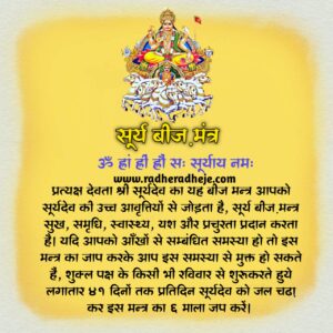 प्रत्यक्ष देवता श्री सूर्यदेव का यह बीज मन्त्र आपको सूर्यदेव की उच्च आवृत्तियों से जोड़ता है, सूर्य बीज़ मन्त्र सुख, समृधि, स्वास्थ्य, यश और प्रचुरता प्रदान करता है। यदि आपको आँखों से सम्बंधित समस्या हो तो इस मन्त्र का जाप करके आप इस समस्या से मुक्त हो सकते हैं, शुक्ल पक्ष के किसी भी रविवार से शुरू करते हुये लगातार 41 दिनों तक प्रतिदिन सूर्यदेव को जल चढ़ा कर इस मन्त्र का 6 माला जप करें।