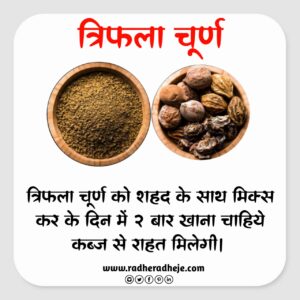 रात को सोते वक्त 5 ग्राम (एक चम्मच भर) त्रिफला चुर्ण हल्के गर्म दूध अथवा गर्म पानी के साथ लेने से कब्ज दूर होता है। अथवा त्रिफला व ईसबगोल की भूसी दो चम्मच मिलाकर शाम को गुनगुने पानी से लें इससे कब्ज दूर होता है।