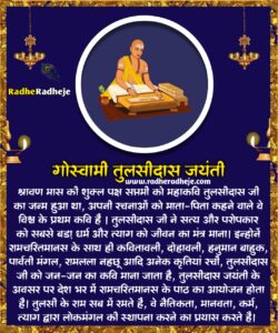 गोस्वामी तुलसीदास जी हिन्दी साहित्य के महान सन्त कवि थे, जिन्हें आदि काव्य रामायण के रचयिता महर्षि वाल्मीकि का अवतार भी माना जाता है। इनका जन्म स्थान विवादित है। वहीं हिन्दू पंचांग के अनुसार श्रावण मास के शुक्ल पक्ष की सप्तमी तिथि को अधिकतर लोग तुलसीदास जी का जन्म उत्सव मनाते हैं।