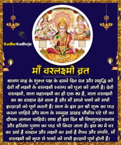 श्रावण माह के शुक्ल पक्ष के दसवें दिन धन और समृद्धि की देवी माँ लक्ष्मी के वरलक्ष्मी स्वरुप की पूजा की जाती है। देवी वरलक्ष्मी, माता महालक्ष्मी का ही एक रूप है, माता वरलक्ष्मी का रूप वरदान देने वाला है और माँ अपने भक्तों की सभी इच्छाओं को पूर्ण करती हैं। माता के इस व्रत श्री सूक्त का पाठ करना चाहिये और माता के सम्मुख अखंड चौबीस घंटे घी का दीपक जलाना चाहिये। साथ ही इस दिन श्री विष्णुसहस्त्रनाम और हरिवंश पुराण का पाठ भी किया जाता है। इस रूप में वर का अर्थ है वरदान और लक्ष्मी का अर्थ है वैभव और संपत्ति, माँ वरलक्ष्मी की कृपा से भक्तों की सभी इच्छायें पूर्ण होती हैं।